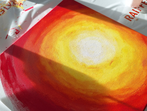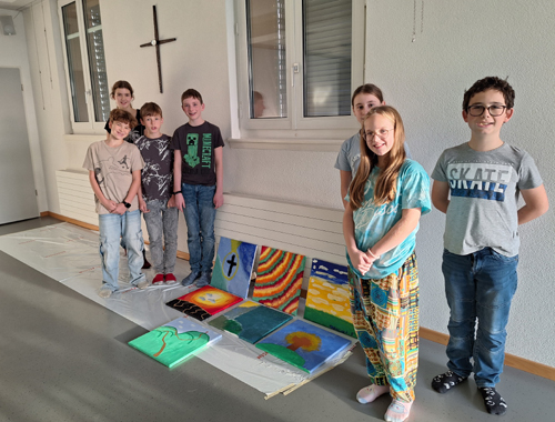 Nun ging es in die Phase, dass ein jedes seine Gefühle auf Leinwand verewigen konnte. Sie schauten sich Bilder moderner Kunst an, in denen die Künstler ihr Gottesbild darstellten. Mit ruhiger Musik und nach einigen Instruktionen machten sich alle an ihr Werk. Es wurde konzentriert und mit viel Freude, ruhig an den Bildern gearbeitet. Jedes Kind gab seinem Werk noch einen Namen. Sie entschieden sich für folgende Namen: «Weg zu Gott», «Im Licht», «Beschützt», «Lichtblick», «Wolkenkraft», «Gott im Zentrum» und «göttliche Kunst».