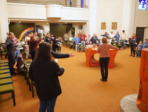 Das obligate Lied mit Bewegungen, der zweite Teil der Geschichte von Abraham und Sara und die besinnlichen Fürbitten gehörten zur anschliessenden gemeinsamen Feier in der Kirche. Der Segen im Kreis mit passenden Gesten war wie gewohnt auf einer Karte festgehalten, die alle, die wollten als Erinnerung mit nach Hause nehmen konnten.