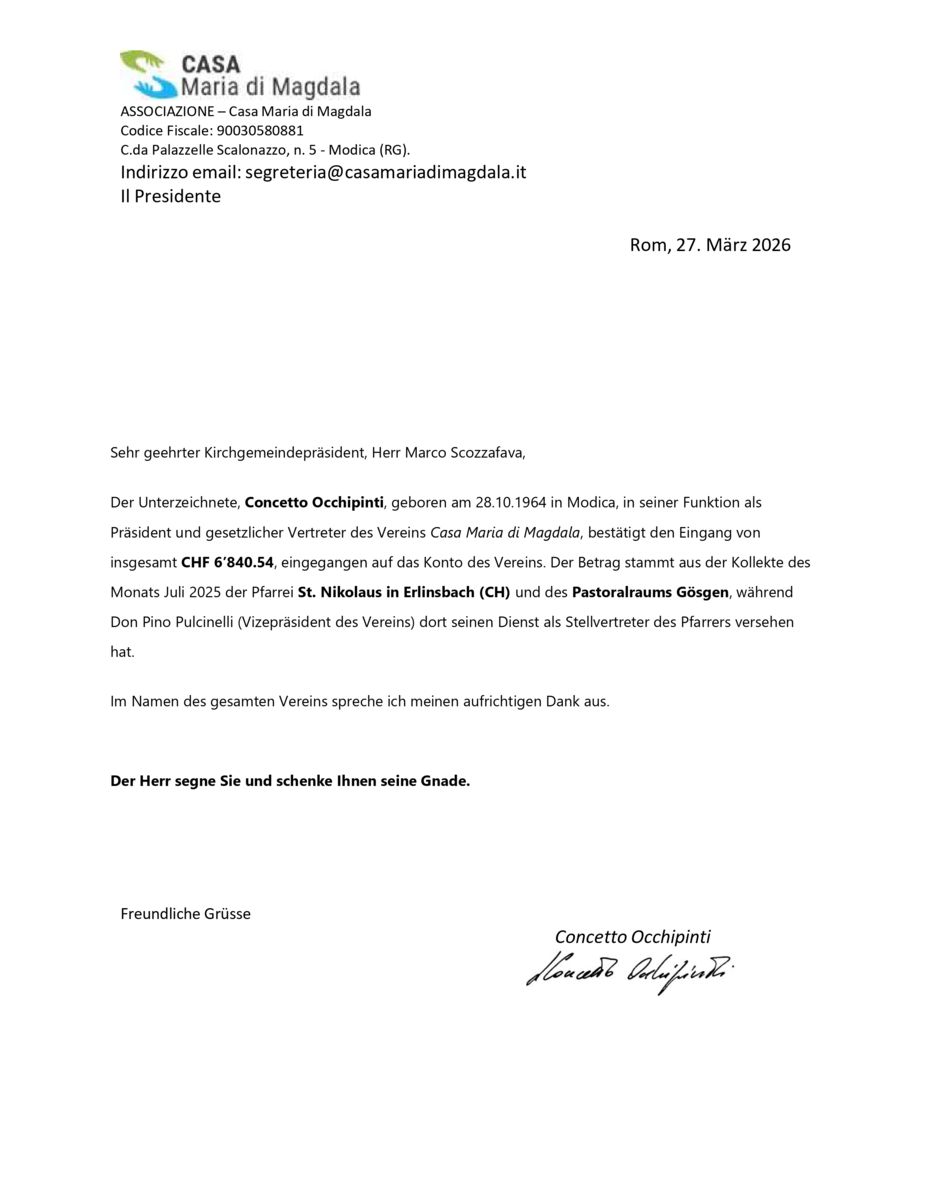 Mit dem Weggang von Pfarrer Jürg Schmid stehen für die Abdeckung aller Gottesdienste im Pastoralraum zu wenig Liturgen zur Verfügung. Deshalb hat das Seelsorgeteam beschlossen, die Donnerstagsgottesdienste abwechselnd in Winznau und in Obergösgen je für beide Pfarreien zu halten. Bitte entnehmen Sie die genauen Angaben dem Pfarrblatt. Wir bitten um Ihr Verständnis.