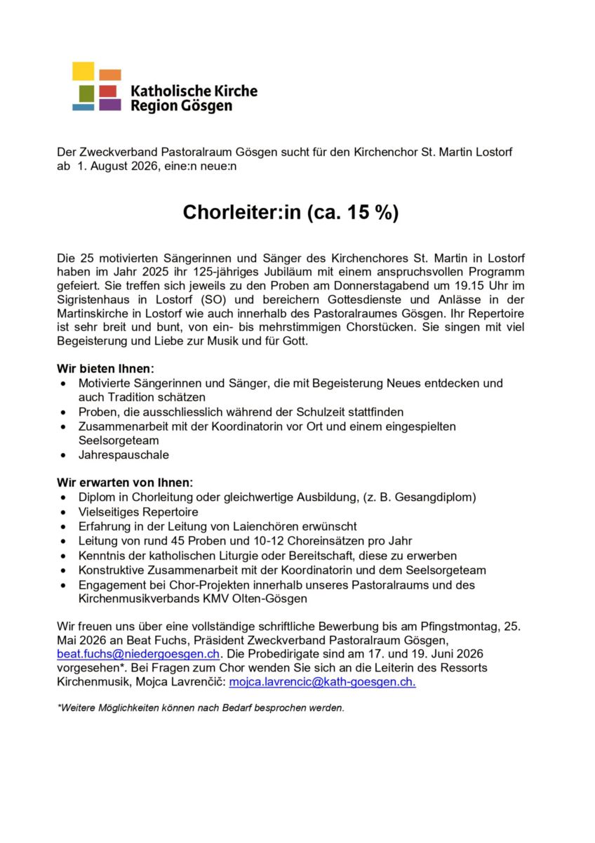Chorleiter:in (ca. 15 %), St. Martin Lostorf