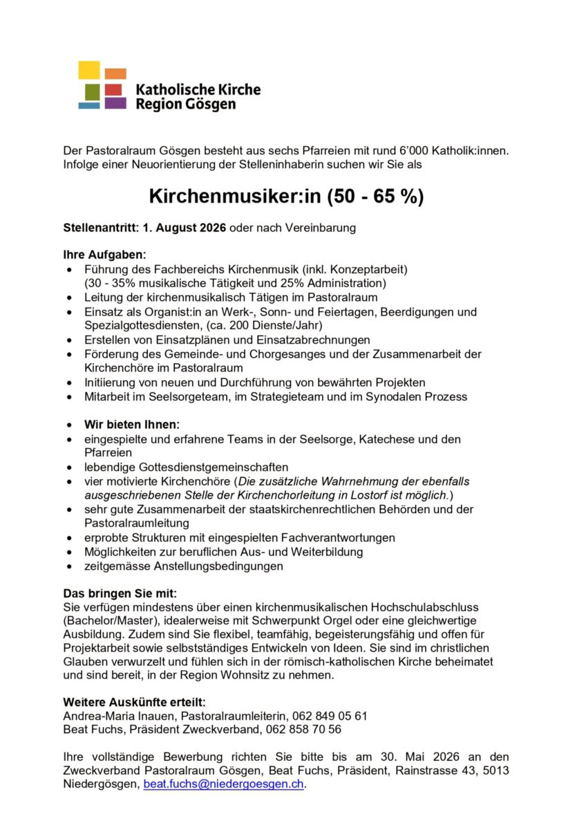 Susanne Bucher, Organistin und Chorleiterin in Niedergösgen, wurde seit kurzem als Fachverantwortliche Ressort Kirchenmusik im Pastoralraum Gösgen vom Zweckverband angestellt. Sie ist Ansprechperson für Fragen und Anliegen im Bereich Kirchenmusik und wird musikalische Projekte im Pasoralraum Gösgen initiieren und fördern. Im Pastoralraumteam wird sie das Thema Kirchenmusik in seinen vielseitigen Facetten zur Sprache bringen und vertreten.