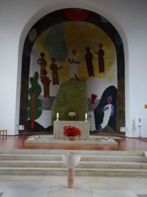 Die Pfarrkirche St. Nikolaus in Erlinsbach SO wurde um 1870 von Wilhelm Keller im neuromanischen Stil errichtet und 1910 von der Wiler Werkstätte Glauner üppig ausgestattet. 1956 kam es im Innern zu einer radikalen Umgestaltung durch den Basler Architekten Hermann Baur. Die Pfarrkirche könnte heute zu einer der vielen, etwas gesichtslosen "ausgeräumten" Sakralbauten gehören, welche in den 50-Jahren oft mit wenig Fingerspitzengefühl umgestaltet wurden. Die Verantwortlichen zeigten damals aber durchaus auch Gespühr für Kunst und hatten den Mut, mit der künstlerischen Ausgestaltung Ferdinand Gehr zu beauftragen. Das von Gehr geschaffene künstlerische Ensemble, das die 14 Langhausfenster, die Apsismalerei und eine Vortragsfahne umfasst, ist bemerkenswert.
